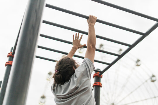 fitness workout on monkey bars outdoors, arm muscles training, climbing on ladder