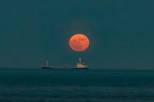 Dawn moon and Mt. Fuji dyed red at sunrise.