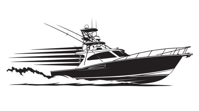 Powerful sport fishing boat cruising through ocean waters, a dynamic monochrome marine adventure, evoking thrill and the promise of a big catch, perfect for nautical themes