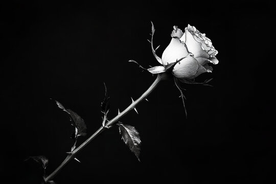 The image is a black and white photograph of a single rose on a thorny stem against a dark background