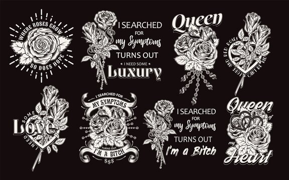 Set of black and white vintage labels with roses, dollar sign, chains with rhinestones, text, quotes. Vector monochrome illustration. T-shirt design.