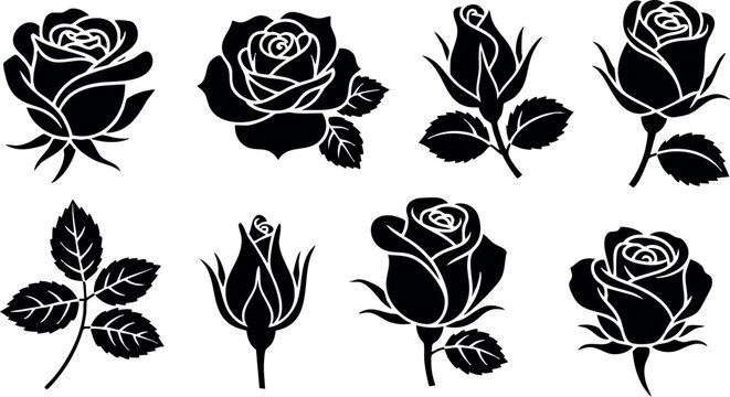 Black silhouette rose flowers and buds vector illustration set natural floral design elements
