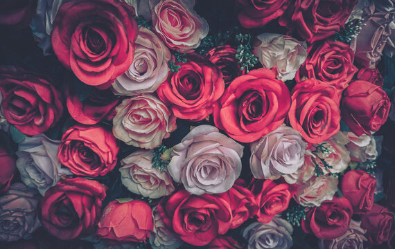 A close-up of a cluster of pink, red, and white roses with a vintage aesthetic.
