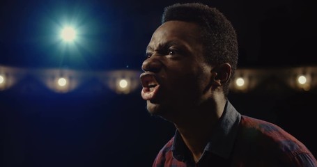 Happy young african american man comic tells stand up monologue on stage with red curtains. Concept humor standup comedian show open mike
