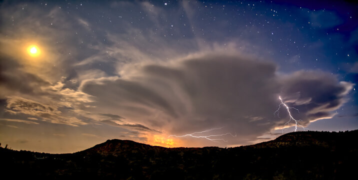 An isolated storm cell near Chino Valley being lit by the Moonlight during the summer monsoon season, Arizona