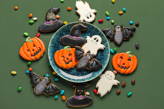 Bowl with Halloween cookies and candies on green background