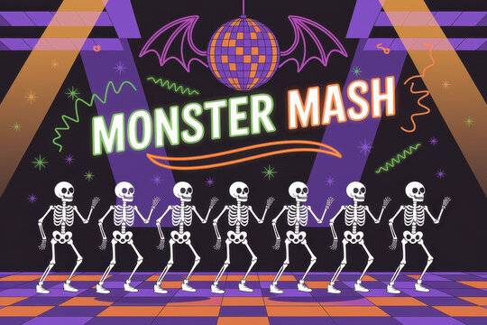 Halloween dance party: skeletons grooving under disco ball with monster mash theme