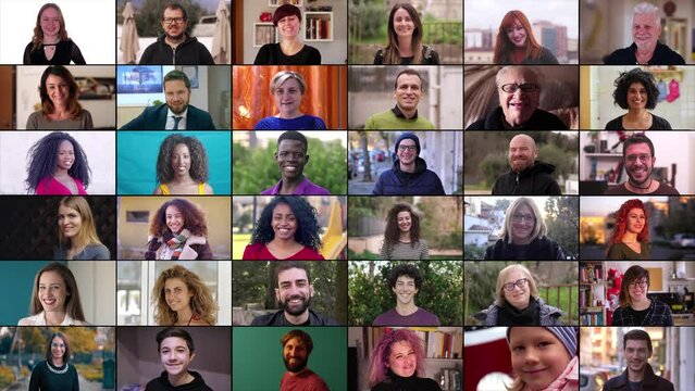 multiscreen of women and men looking at the camera smiling - joyful, carefree
