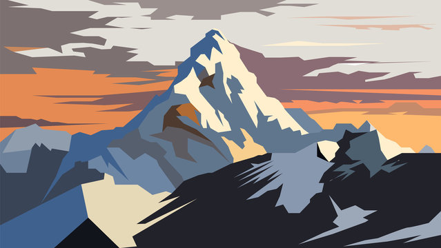 Vector drawing of the mountain peak. Highest mountain peak on the planet. Vector illustration of mountains, rocks and peaks.