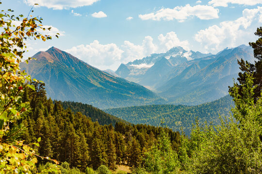 beautiful view of mountains with snow and mountains covered with forest