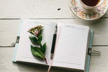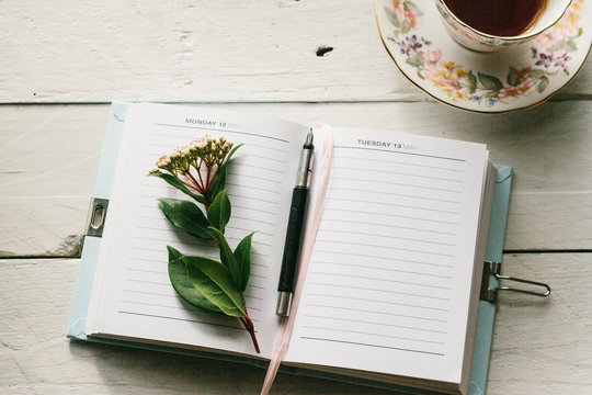 A journal open at a page in May with the flower of a spring-flowering shrub.