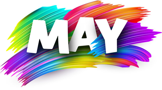 May paper word sign with colorful spectrum paint brush strokes over white.