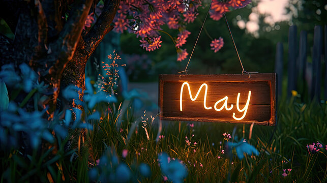 May sign written in neon sign letters for the month of may. Outdoor nighttime spring scene