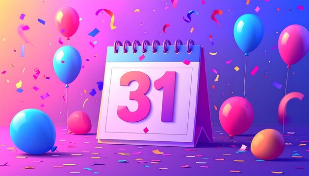 Vibrant graphic of a calendar showing day 31, with festive confetti and colorful balloons, ideal for celebration events