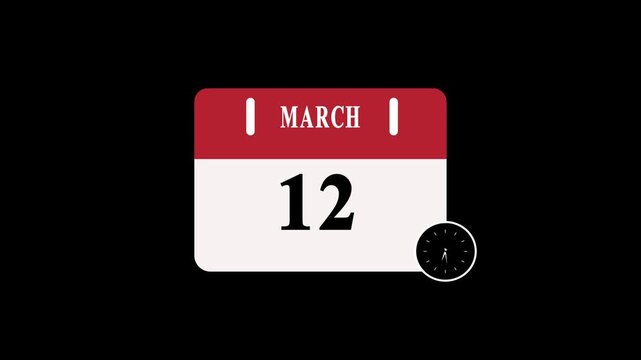 12 March date Calendar Page with Clock countdown animation on black Background. Digital calendar month and date concept design.