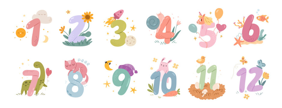 Children milestones, month or years anniversary for kids. Vector in flat style, baby monthly numbers cards. Animals and cute characters, greeting posters and postcards for celebration, banners
