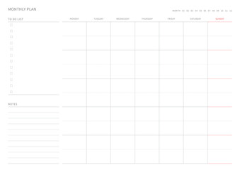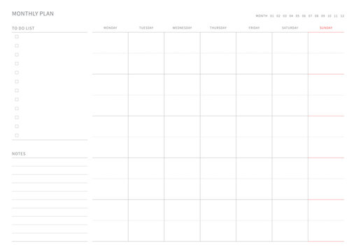 A monthly plan template with a simple and minimal style. Note, scheduler, diary, calendar planner document template illustration.