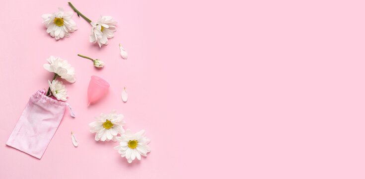 Menstrual cup and beautiful chamomiles on pink background with space for text