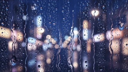 Cityscape view through rain-soaked anime-inspired window at night with blurred lights