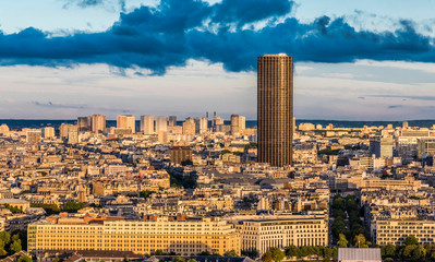 Aerial panoramic view of Montpernasse skyscraper and Paris skyline in sunny day