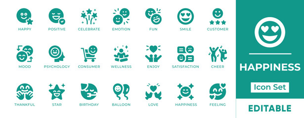 Happiness Icon Set. Features icons of joy, smiling faces, positive emotions, well-being, and celebration. Perfect for wellness, lifestyle, and mental health projects.