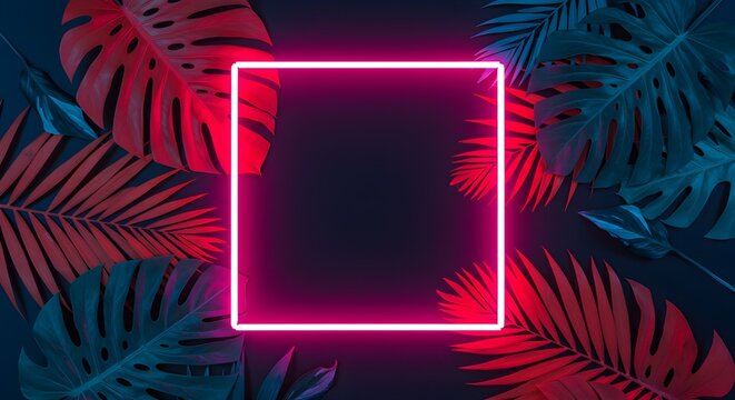 Red and teal leaves glow, surrounding a neon square. Evokes tropical mood for social media, digital art, presentation background.
