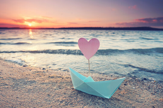 romantic sunset with colorful paper boat at the beach