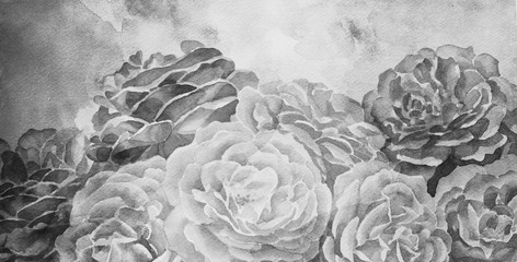 black and white roses in hand painted watercolor background design, romantic mood for wedding announcement or valentines day