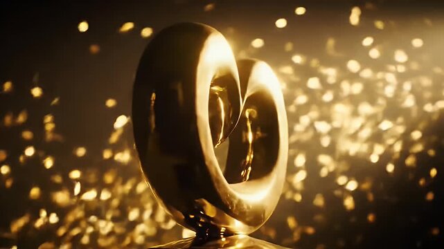 Golden heart rotating in front of shimmering bokeh lights with romantic and celebratory mood