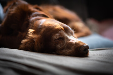 Closeup of sad golden retriever dog on carpet, indoor pet looking depressed and ill indoors