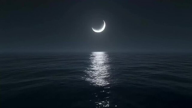 A serene concept of a glowing crescent moon reflecting over the calm ocean water at night.
