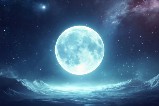 Surreal giant blue moon shining over space mountains in starry night sky background for astronomy planet design concept