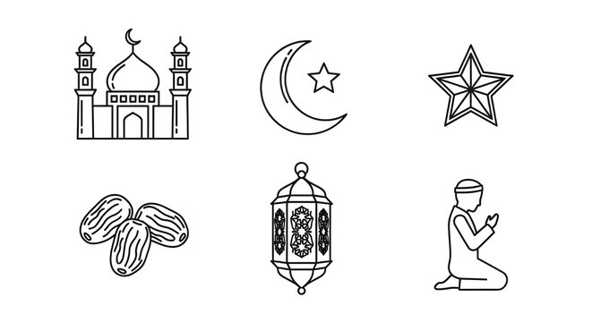 Set of Islamic Line Icons Mosque, Crescent Moon, Dates, Lantern, and Praying Man.