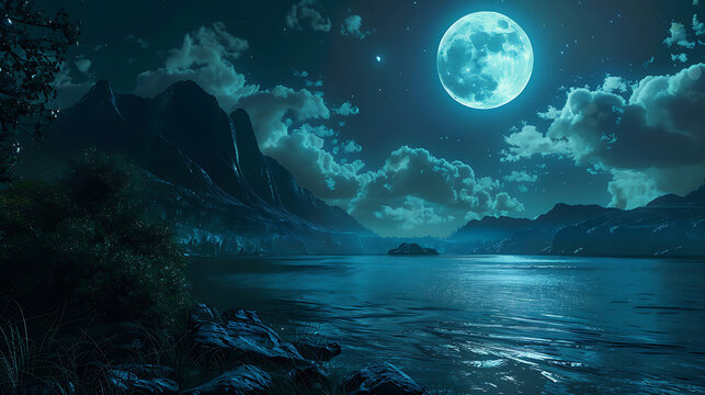 Luminous full moon illuminates starry night sky over calm ocean reflecting shimmering moonlight and dramatic clouds