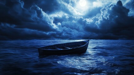 an isolated wooden boat adrift on a tranquil ocean beneath a serene moonlit sky offering a scene of solitude and ethereal beauty at night under a cloudy sky