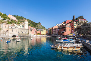 Italy, Liguria, Vernazza, Edge of coastal town along Cinque Terre with boats moored in foreground