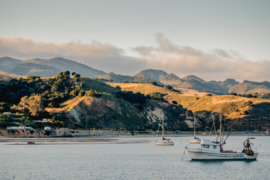 The picturesque scene unfolds as rolling hills meet the tranquil sea, adorned with boats  moored along the coastline