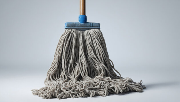 A cotton  head of classic mop on  wooden floor against blue wall