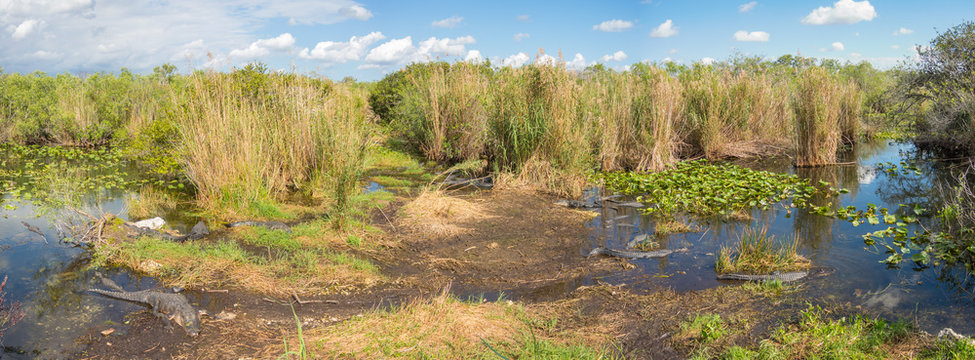 Picturesque lake backwaters in the middle of swamps. Landscape with sky and water.