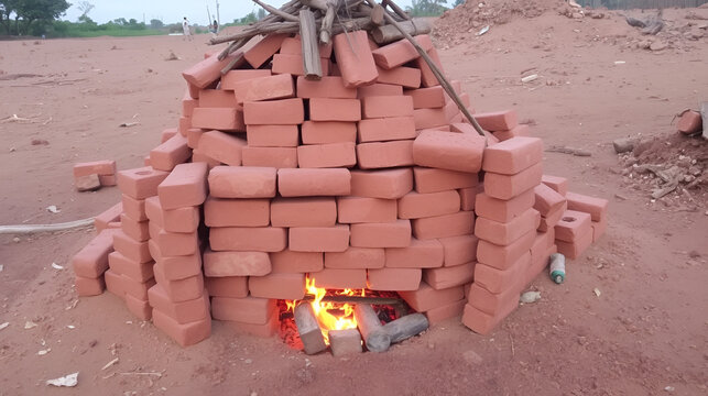 A makeshift kiln of stacked mud bricks smolders beneath a heap o.