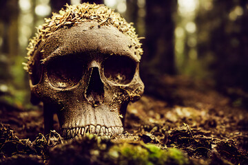 3d illustration of a human skull found alone in a forest, of a dead man, morbid atmosphere