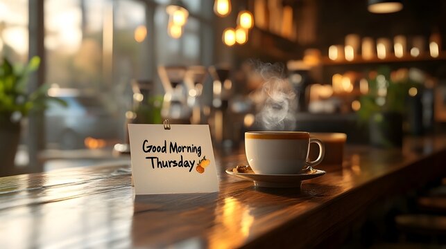 Minimalist Wooden Desk With 3D Rendered Thursday Morning Note and Coffee Cup