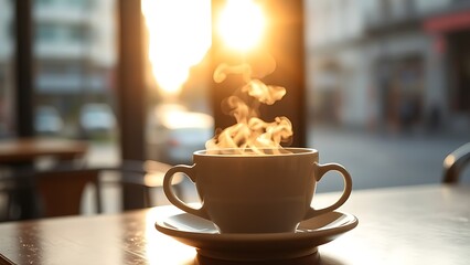 A steaming cup of coffee on a cafe table, warmed by morning sunlight.