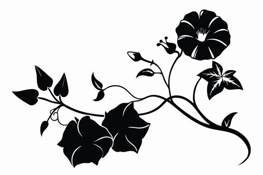 Elegant Black and White Morning Glory Vine with Flowers, Buds, and Leaves