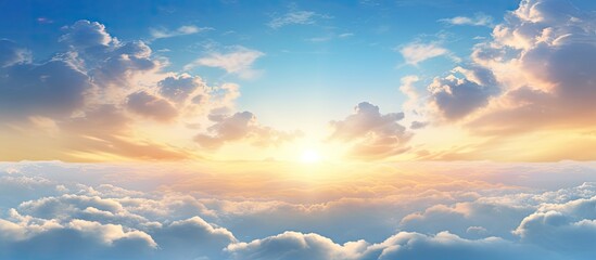 A serene morning scene with clear blue skies, beautiful fluffy clouds, and a warm sunrise, ideal for a copy space image with a nature background.