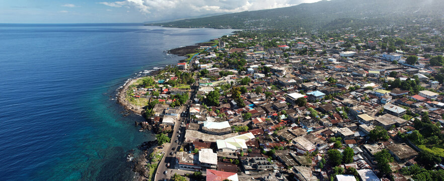 Sunset boats in holiday paradise resort on Grand Comore island, Comoros. Beautiful sunset light of sun in the sea. Villas on the beach with private beach. Moroni Comoros, Itsandra beach resort hotel