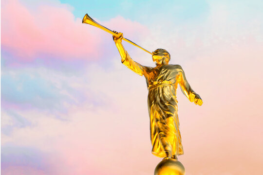 mormon faith symbol with angel moroni blowing trumpet icon vector illustration