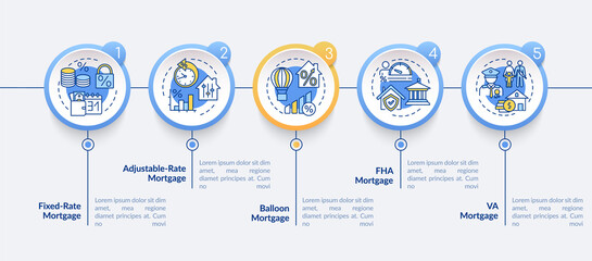 Loan types vector infographic template. Fixed-rate, balloon mortgage presentation design elements. Data visualization with 5 steps. Process timeline chart. Workflow layout with linear icons