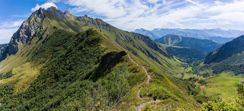 Skiers in French Alps carve turns as they make their way down a piste in Avoriaz, Portes du Soleil ski area. Swiss Alps can be seen in background
