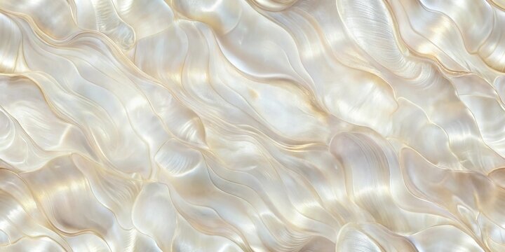Mother of Pearl Texture: Close-up view of a mother-of-pearl surface, showcasing its iridescent and swirling patterns, with varying shades of creamy white and soft beige.